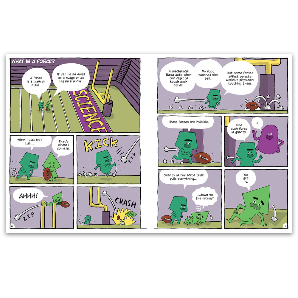 What is a force, and what is motion? Follow the funny characters “Force” and “Motion” as they punt a football, ride a bicycle, and blast off in a rocket plane to find out! Through bright and colorful comic-book-style pages, kids will explore such concepts as friction, acceleration, and speed. They will have fun learning about pulleys, levers, and other simple machines.